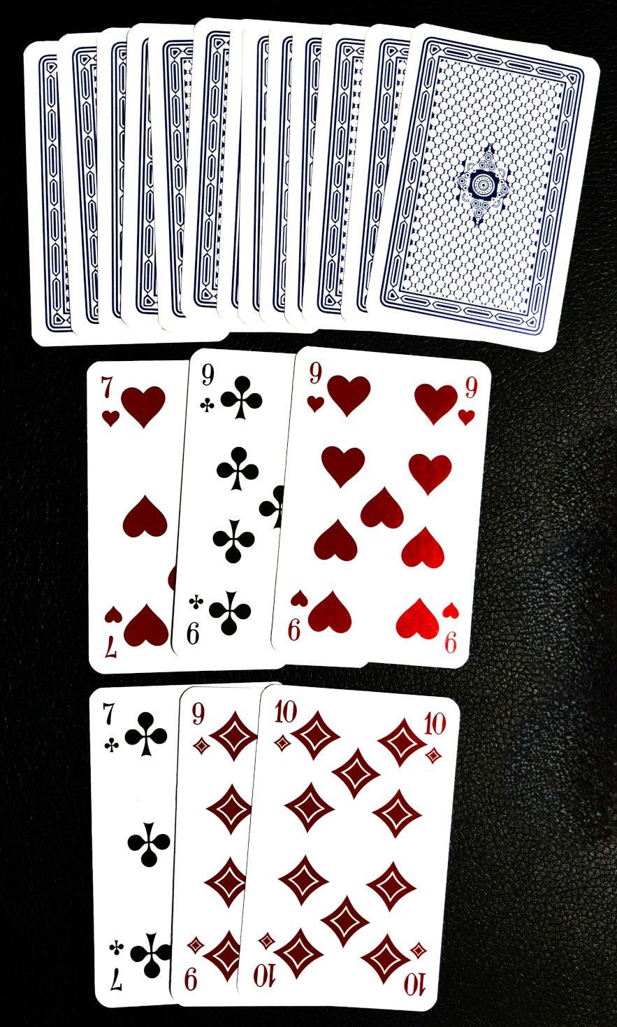 Erfinden Sie Ihr eigenes Glücksspiel mit Hilfe von Spielkarten! Zum Beispiel: Entfernen Sie aus einem Skat-Blatt den „Hofstaat“, also Buben, Damen und Könige. Person A mischt die verbliebenen 20 Karten und legt den Stapel verdeckt hin; Person B zieht 3 Karten; wenn sich eine der Zahlen 7, 8, 9, 10 oder 11 (=Ass) genau zweimal hierunter befindet, dann erhält B die Summe der drei Zahlenwerte, anderen falls Null. Danach tauschen A und B die Rollen. Wer hierbei die höhere Zahl erreichte, hat gewonnen. Beispiel: A zieht 7, 9, 9; weil die „9“ genau zweimal vorkommt, erhält B die Zahl 7+9+9 = 25; dann mischt B und A zieht 7, 9, 10; keine Zahl tritt hier genau zweimal auf, also erhält A die Zahl Null. Folglich hat B gewonnen.